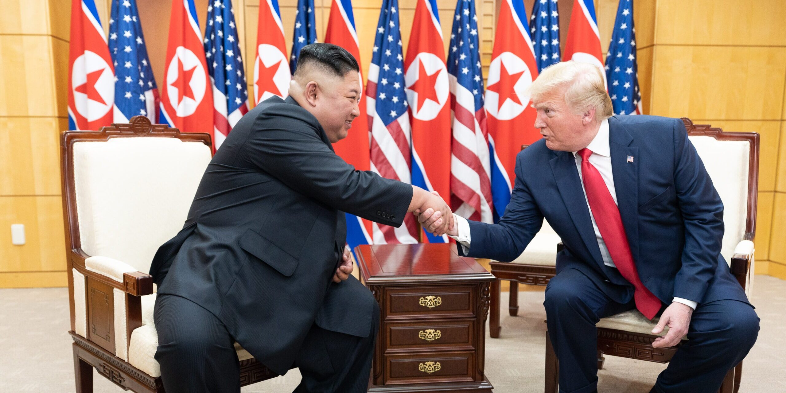 Kim Jong Un shakes hands with President Donald Trump, as they sit in front of North Korean and American flags