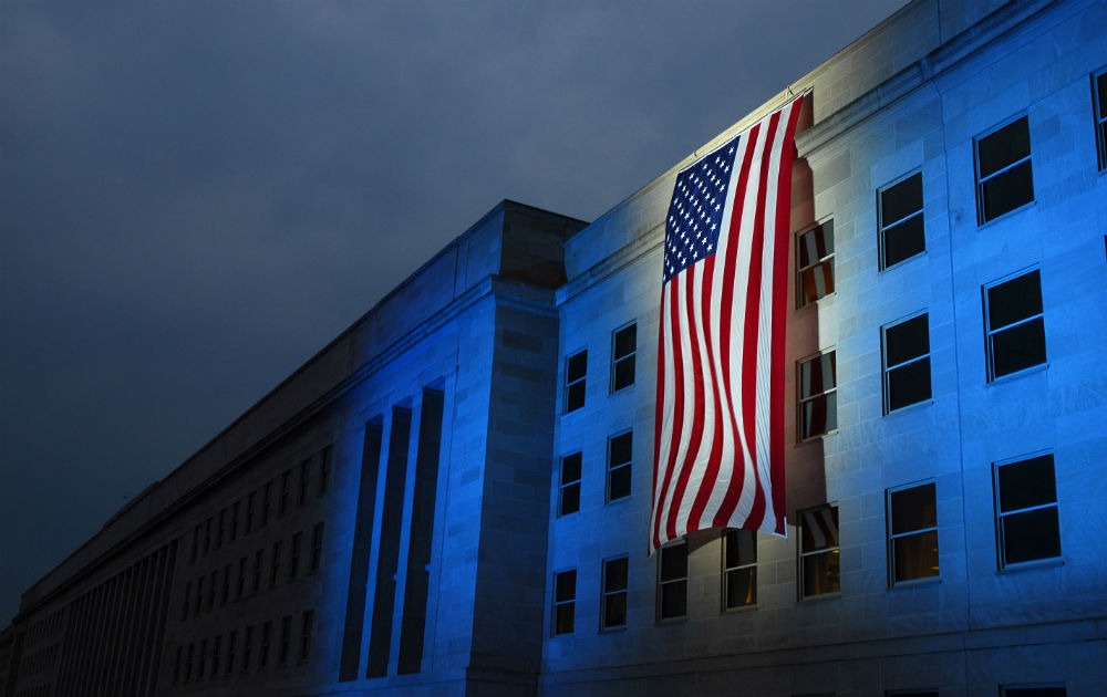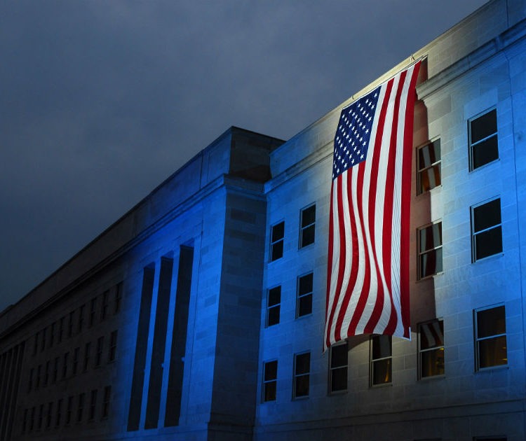 A flag is illuminated near spot where American Airlines Flight 77 Crashed into the Pentagon.