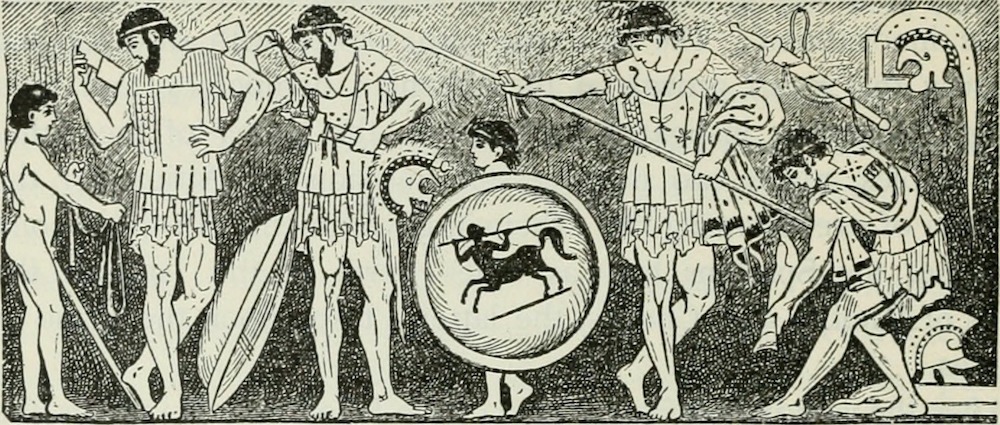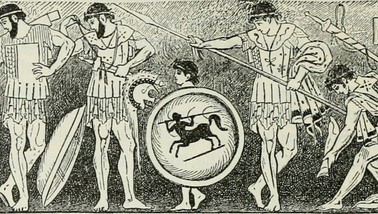 Drawing of ancient Greeks holding weapons and shields.